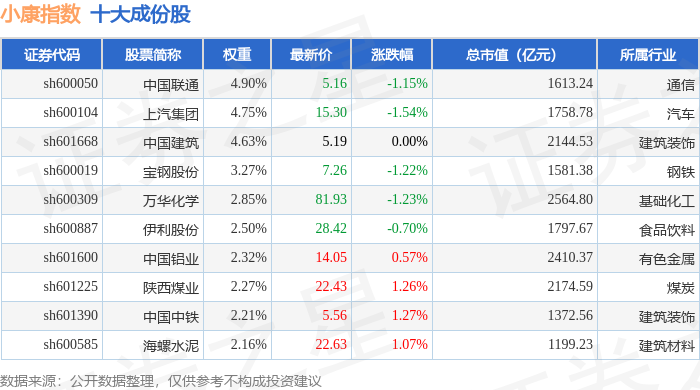 小康指数(000901)十大成份股详情如下: