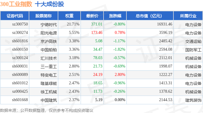 300工业(000910)指数十大成份股详情如下:
