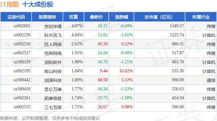 证券之星消息,1月7日,IT指数(399239)报收于2135.88点,跌0.55%,成交1418.13亿元,换手率4.86%。当日该指数成份股中,上涨的有63家,观想科技以20.0%的涨幅领涨,下跌的有180家,荣科科技以20.0%的跌幅领跌。