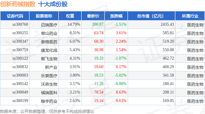 创新药械(399265)指数十大成份股详情如下: