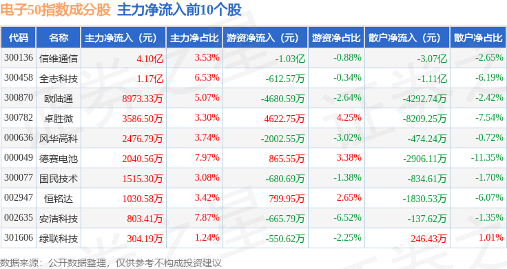 资金流向方面,电子50(399281)指数成份股当日主力资金净流出合计74.99亿元,游资资金净流入合计25.12亿元,散户资金净流入合计49.87亿元。成份股资金流向详情见下表: