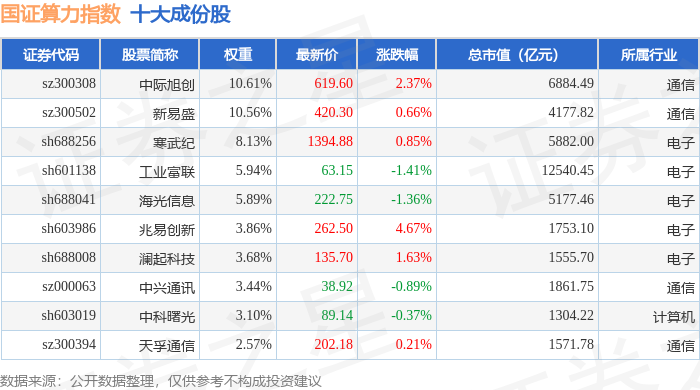 国证算力(399363)指数十大成份股详情如下: