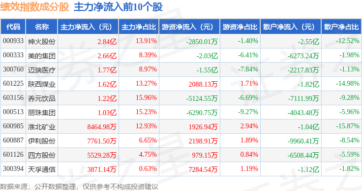 资金流向方面,绩效指数(399398)成份股当日主力资金净流出合计13.79亿元,游资资金净流入合计4.57亿元,散户资金净流入合计9.22亿元。成份股资金流向详情见下表: