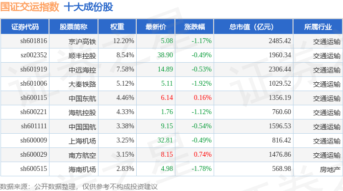 国证交运(399433)指数十大成份股详情如下: