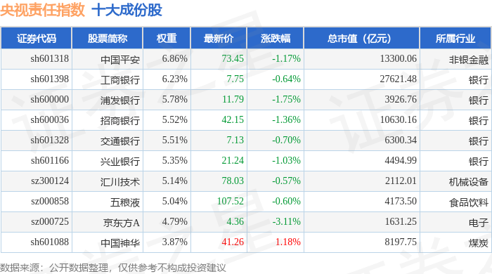 证券之星消息,1月7日,央视责任(399555)指数报收于5448.78点,跌0.78%,成交630.93亿元,换手率0.71%。当日该指数成份股中,上涨的有11家,上实发展以3.72%的涨幅领涨,下跌的有38家,乐普医疗以5.02%的跌幅领跌。