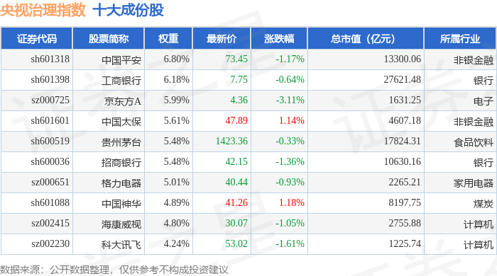 央视治理(399554)指数十大成份股详情如下: