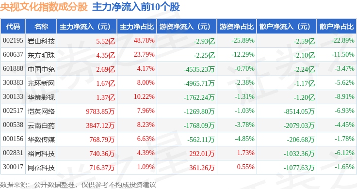资金流向方面,央视文化(399557)指数成份股当日主力资金净流出合计36.55亿元,游资资金净流入合计5.37亿元,散户资金净流入合计31.17亿元。成份股资金流向详情见下表: