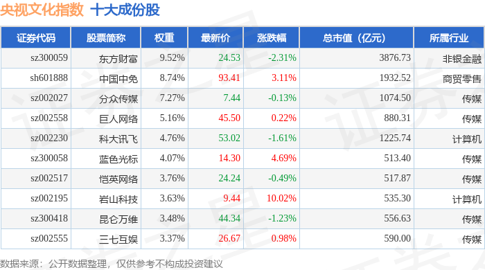 央视文化(399557)指数十大成份股详情如下: