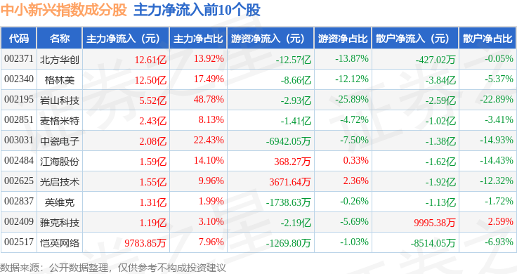 资金流向方面,中小新兴(399642)指数成份股当日主力资金净流出合计129.67亿元,游资资金净流入合计3.81亿元,散户资金净流入合计125.87亿元。成份股资金流向详情见下表: