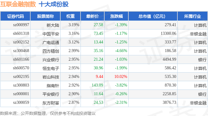 互联金融(399805)指数十大成份股详情如下: