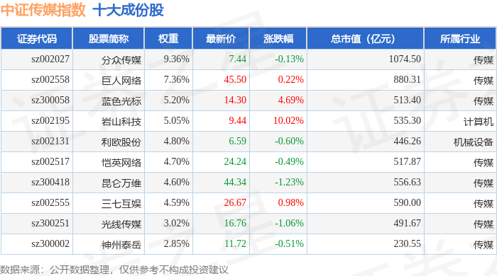 证券之星消息,1月7日,中证传媒(399971)指数报收于1579.76点,涨0.8%,成交649.88亿元,换手率5.42%。当日该指数成份股中,上涨的有13家,岩山科技以10.02%的涨幅领涨,下跌的有37家,南方传媒以3.77%的跌幅领跌。