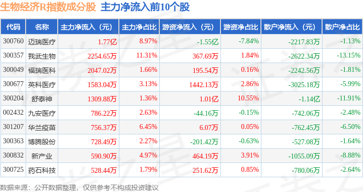 资金流向方面,生物经济R(470038)指数成份股当日主力资金净流出合计6.88亿元,游资资金净流入合计8721.68万元,散户资金净流入合计6.01亿元。成份股资金流向详情见下表: