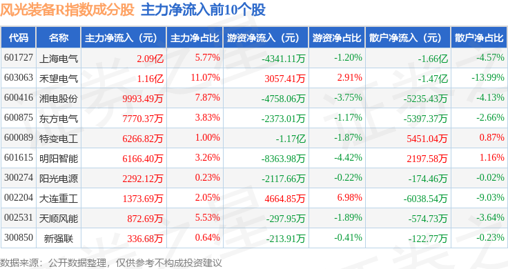 资金流向方面,风光装备R(480026)指数成份股当日主力资金净流出合计10.93亿元,游资资金净流入合计1.89亿元,散户资金净流入合计9.04亿元。成份股资金流向详情见下表: