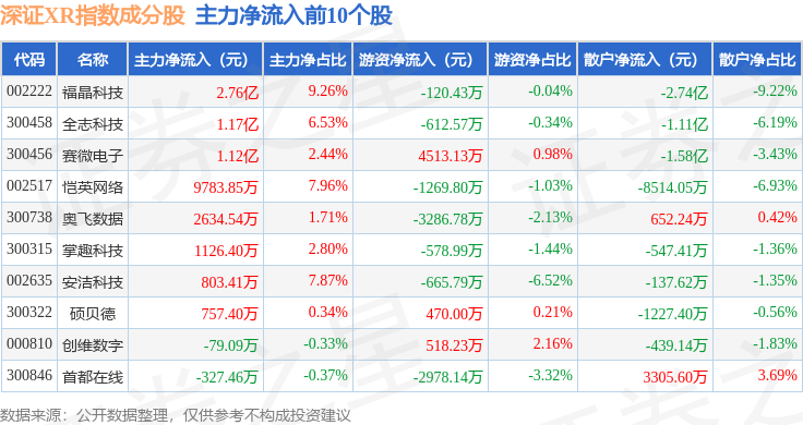 资金流向方面,深证XR(970046)指数成份股当日主力资金净流出合计85.32亿元,游资资金净流入合计24.48亿元,散户资金净流入合计60.84亿元。成份股资金流向详情见下表: