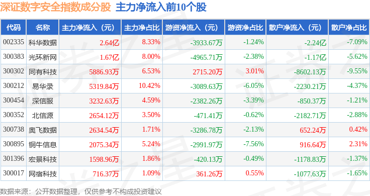 资金流向方面,深证数字安全(970052)指数成份股当日主力资金净流出合计28.13亿元,游资资金净流入合计2.3亿元,散户资金净流入合计25.83亿元。成份股资金流向详情见下表: