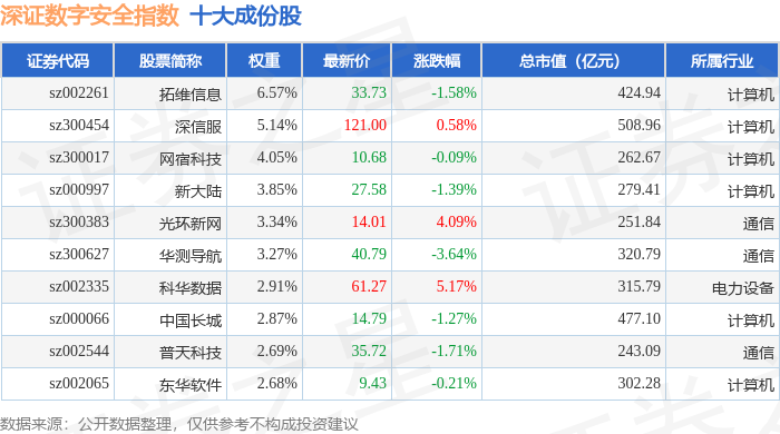 证券之星消息,1月7日,深证数字安全(970052)指数报收于3530.92点,跌1.37%,成交452.85亿元,换手率5.09%。当日该指数成份股中,上涨的有14家,科华数据以5.17%的涨幅领涨,下跌的有35家,荣科科技以20.0%的跌幅领跌。