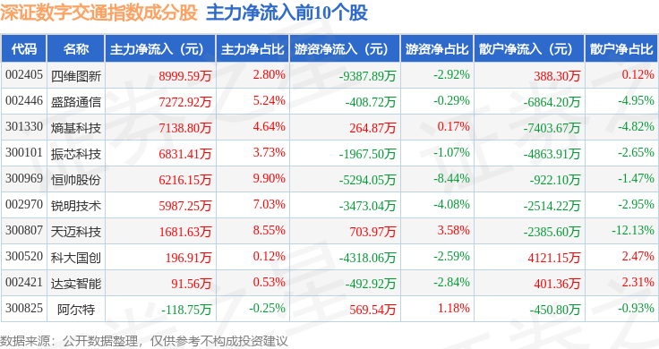 资金流向方面,深证数字交通(970049)指数成份股当日主力资金净流出合计35.02亿元,游资资金净流入合计3.78亿元,散户资金净流入合计31.24亿元。成份股资金流向详情见下表: