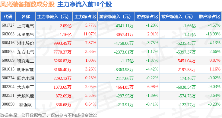资金流向方面,风光装备(980026)指数成份股当日主力资金净流出合计10.93亿元,游资资金净流入合计1.89亿元,散户资金净流入合计9.04亿元。成份股资金流向详情见下表: