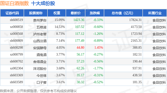 国证白酒(980031)指数十大成份股详情如下: