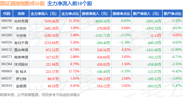 资金流向方面,国证酒指(980049)指数成份股当日主力资金净流出合计2.88亿元,游资资金净流入合计2.77亿元,散户资金净流入合计1153.22万元。成份股资金流向详情见下表:
