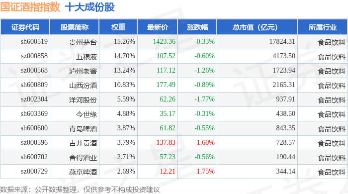 国证酒指(980049)指数十大成份股详情如下: