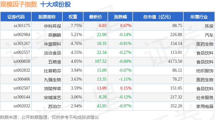 规模因子(980055)指数十大成份股详情如下: