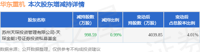 证券之星消息,1月7日华东重机发布公告《华东重机:关于股东提前终止减持计划暨减持结果的公告》,其股东苏州天琛投资管理有限公司-天琛金艇1号证券投资私募基金于2025年10月28日至2026年1月6日间合计减持998.59万股,占公司目前总股本的0.991%,变动期间该股股价上涨1.47%,截止1月6日收盘报7.61元。