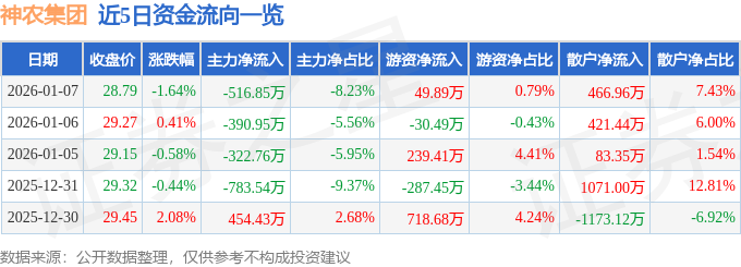 证券之星消息,截至2026年1月7日收盘,神农集团(605296)报收于28.79元,下跌1.64%,换手率0.42%,成交量2.17万手,成交额6282.28万元。