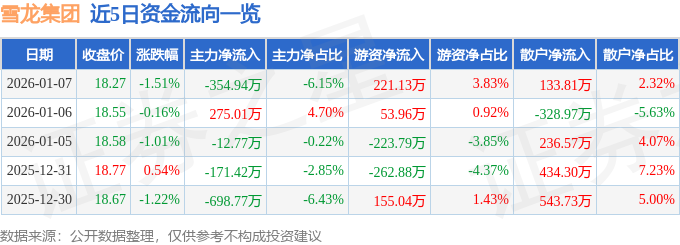 证券之星消息,截至2026年1月7日收盘,雪龙集团(603949)报收于18.27元,下跌1.51%,换手率1.5%,成交量3.15万手,成交额5776.07万元。