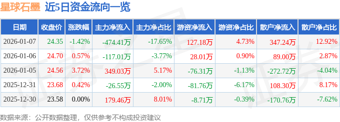 证券之星消息,截至2026年1月7日收盘,星球石墨(688633)报收于24.35元,下跌1.42%,换手率0.77%,成交量1.1万手,成交额2688.16万元。