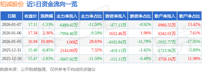 证券之星消息,截至2026年1月7日收盘,柏诚股份(601133)报收于17.11元,下跌1.33%,换手率20.1%,成交量30.03万手,成交额5.19亿元。