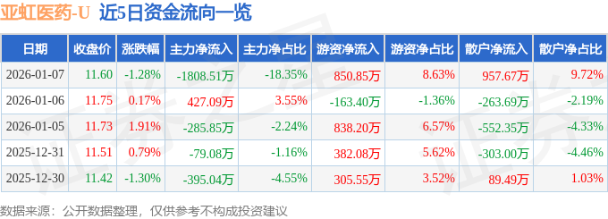 证券之星消息,截至2026年1月7日收盘,亚虹医药(688176)报收于11.6元,下跌1.28%,换手率1.94%,成交量8.45万手,成交额9854.9万元。