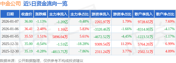 证券之星消息,截至2026年1月7日收盘,中金公司(601995)报收于36.0元,下跌1.13%,换手率1.2%,成交量35.06万手,成交额12.65亿元。