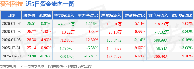证券之星消息,截至2026年1月7日收盘,爱科科技(688092)报收于26.51元,下跌0.97%,换手率1.4%,成交量1.16万手,成交额3097.44万元。