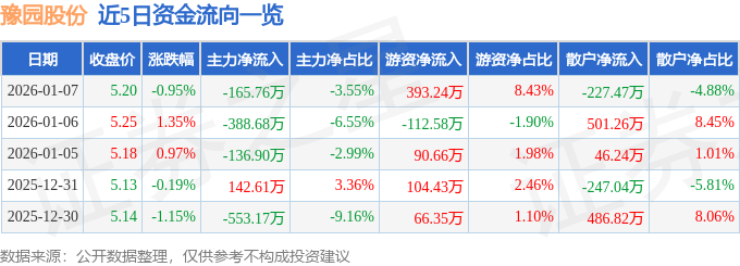 证券之星消息,截至2026年1月7日收盘,豫园股份(600655)报收于5.2元,下跌0.95%,换手率0.23%,成交量8.93万手,成交额4665.67万元。