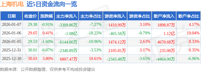 证券之星消息,截至2026年1月7日收盘,上海机电(600835)报收于29.38元,下跌0.91%,换手率1.91%,成交量15.41万手,成交额4.55亿元。