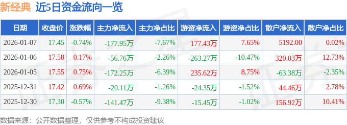 证券之星消息,截至2026年1月7日收盘,新经典(603096)报收于17.45元,下跌0.74%,换手率0.86%,成交量1.33万手,成交额2320.37万元。