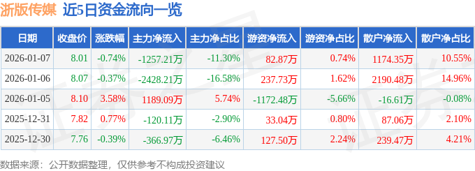 证券之星消息,截至2026年1月7日收盘,浙版传媒(601921)报收于8.01元,下跌0.74%,换手率0.62%,成交量13.84万手,成交额1.11亿元。