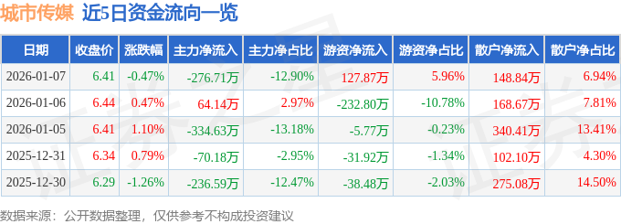证券之星消息,截至2026年1月7日收盘,城市传媒(600229)报收于6.41元,下跌0.47%,换手率0.5%,成交量3.33万手,成交额2144.45万元。