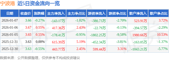 证券之星消息,截至2026年1月7日收盘,宁波港(601018)报收于3.66元,下跌0.27%,换手率0.2%,成交量38.4万手,成交额1.41亿元。