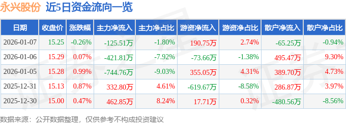 证券之星消息,截至2026年1月7日收盘,永兴股份(601033)报收于15.25元,下跌0.26%,换手率1.9%,成交量4.56万手,成交额6970.5万元。
