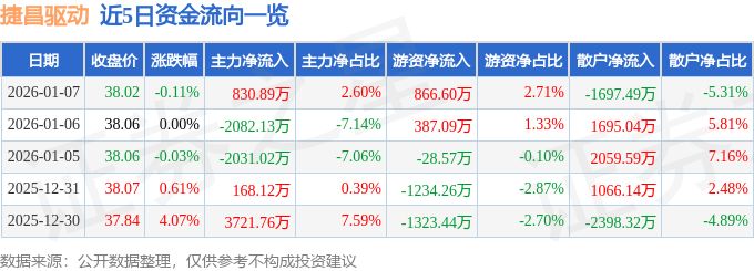 证券之星消息,截至2026年1月7日收盘,捷昌驱动(603583)报收于38.02元,下跌0.11%,换手率2.19%,成交量8.37万手,成交额3.2亿元。