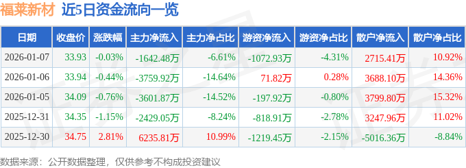 证券之星消息,截至2026年1月7日收盘,福莱新材(605488)报收于33.93元,下跌0.03%,换手率2.65%,成交量7.32万手,成交额2.49亿元。