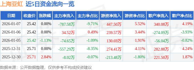 证券之星消息,截至2026年1月7日收盘,上海亚虹(603159)报收于25.42元,上涨0.0%,换手率2.27%,成交量3.18万手,成交额8108.24万元。
