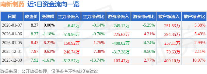 证券之星消息,截至2026年1月7日收盘,南新制药(688189)报收于8.37元,上涨0.0%,换手率2.03%,成交量5.57万手,成交额4672.35万元。