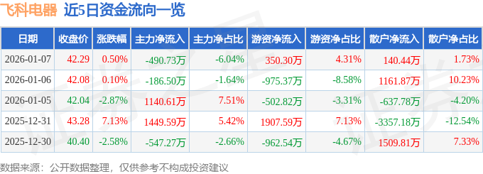 证券之星消息,截至2026年1月7日收盘,飞科电器(603868)报收于42.29元,上涨0.5%,换手率0.44%,成交量1.93万手,成交额8126.47万元。