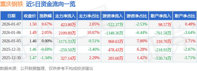 证券之星消息,截至2026年1月7日收盘,重庆钢铁(601005)报收于1.5元,上涨0.67%,换手率1.67%,成交量138.81万手,成交额2.07亿元。