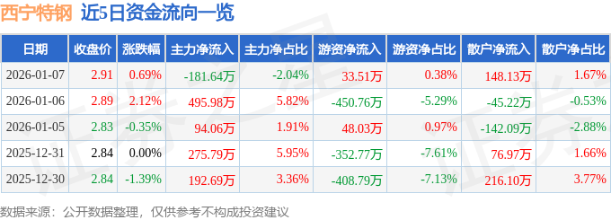 证券之星消息,截至2026年1月7日收盘,西宁特钢(600117)报收于2.91元,上涨0.69%,换手率0.94%,成交量30.68万手,成交额8889.41万元。