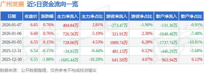 证券之星消息,截至2026年1月7日收盘,广州发展(600098)报收于6.65元,上涨0.76%,换手率0.62%,成交量21.67万手,成交额1.44亿元。