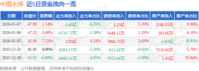 证券之星消息,截至2026年1月7日收盘,中国太保(601601)报收于47.89元,上涨1.14%,换手率0.7%,成交量47.79万手,成交额22.82亿元。